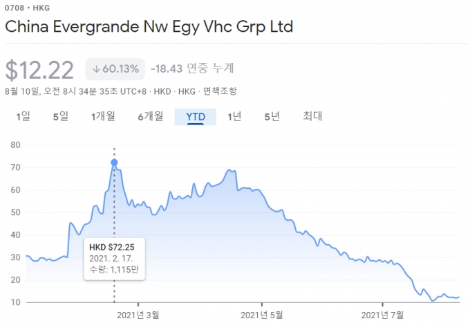 14일현지시간 블룸버그통신에 따르면 헝다자동차 주가는 이날 홍콩 증시에서 28 급락했다. 헝다그룹에 많이 물려 있을 것이란 이유에서다.